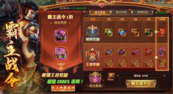 活动介绍:完成任务提升战令等级,领取精英奖励,解锁王者奖励可领取更多豪礼